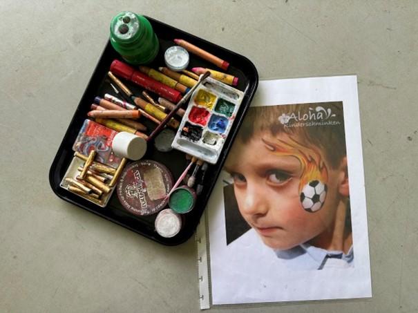 Aber was ist ein Fussballspiel ohne Zuschauer. Die La-Ola-Welle haben wir ja schon geübt. In der Werkstatt mit 21 Posten kann man sich wie ein Fan schminken oder wie ein Fussballstar frisieren. Mit weissen Schweizer-Kreuzen auf roten Gesichtern, farbigen Sternen, die Fans fallen kunterbunt auf.