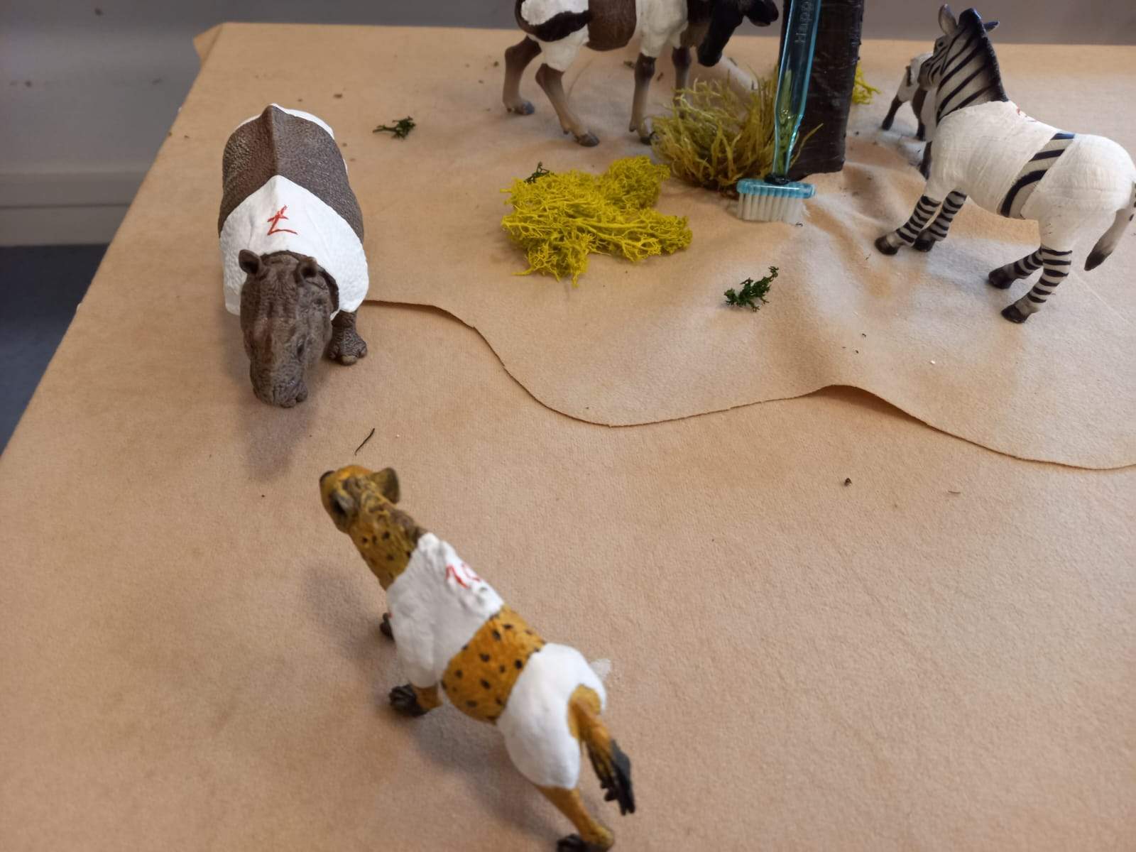 Danach beschäftigen wir uns mit den Fussballkleidern. Die Trikots mit den Rückennummern können wir schon bald zuordnen. Dann kommen die Fussballschuhe an die Reihe. Können die Kinder ihre Schuhe selbst binden, erhalten sie ihre erste Medaille. Und im Kindergarten von Sandra Aschwanden durfte das Kind einem Savannenkicker-Schleichtier ein paar Schuhe aus Knet anziehen. Denn ohne Schuhe gab es bei den Savannen-Tieren immer viele Verletzte. Die Kinder haben das im Rollenspiel erfunden und bald war der Arztkoffer im Umlauf und täglich wurde Tiere behandelt, verbunden und gepflegt.