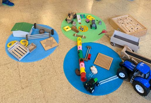 Die Kinder üben sich in "Raumlagen" und der Beschreibung wo z.B. ein Zahn, ein Apfel liegt (oben, unten …)