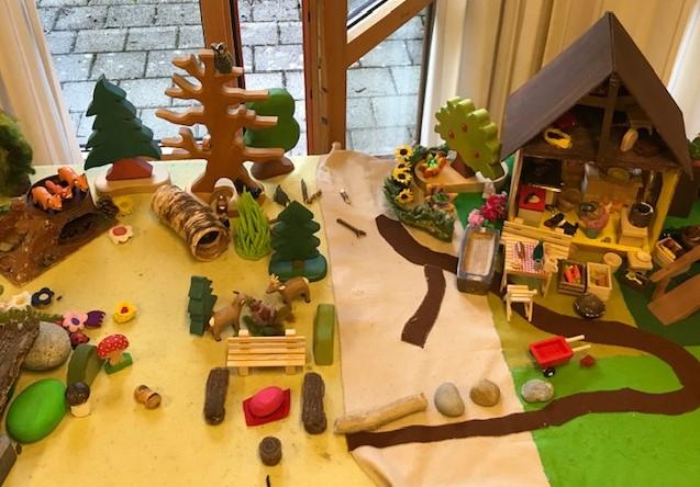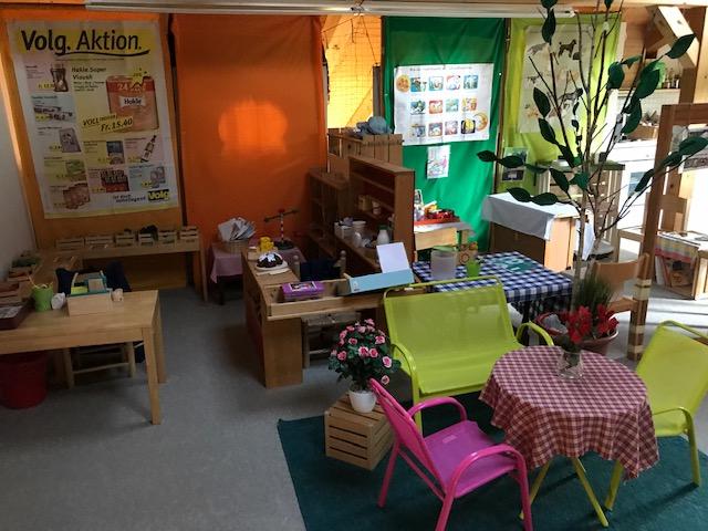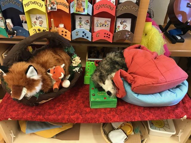 Auch der Bewegungsparcours wird passend zu den Waldtieren aufgebaut. Beim Bauernhaus wird Wäsche aufgehängt, Teeblümchen werden von der Wiese gepflückt, man kann in die Dachshöhle kriechen, beim Froschteich Wasser schöpfen und beim Beerenstrauch Beeren mit der grossen Pinzette pflücken.
