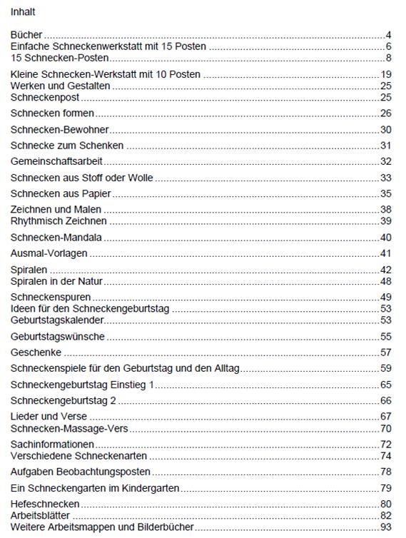 Es gibt sehr viele Werkideen in dieser Arbeitsmappe, Sachinformationen, Arbeitsblätter, sowie Schnecken-Beobachtungsposten. Die Spirale wird thematisiert, eine Schneckenpost entsteht, wir machen Schnecken-Versteinerungen, Strumpfschnecken, Magnet-Schnecken, usw. Alles mit Farbfotos aus den Kindergärten dokumentiert.