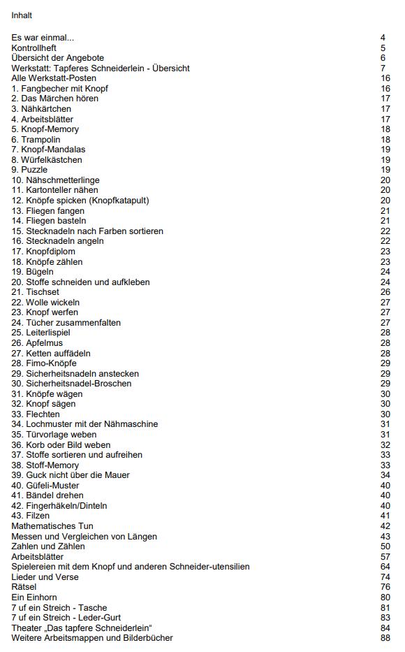Die Werkstatt beinhaltet 43 Posten. Am Schluss des Themas wurde das Theater "das tapfere Schneiderlein" aufgeführt. Anleitungen dazu, sind ebenfalls in der Mappe enthalten.