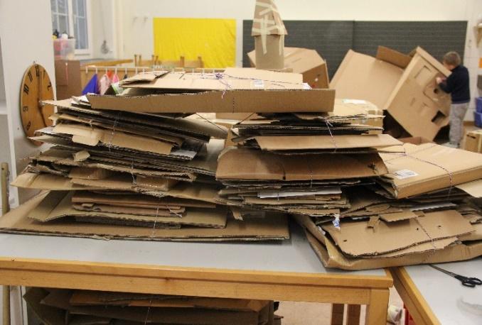 Wir erlernen Techniken und den Umgang mit passendem Werkzeug. Unser Material für die nächsten Wochen: Karton in jeglicher Form und Verfassung, Papier, Zeitungen und wertloses Material. Verbaut wird mit Verbindungsmaterialien wie Maler- und Teppichklebeband, Kabelbinder, Damenstrümpfen, Schnur, Wäscheklammern, Rundkopfklammern ...