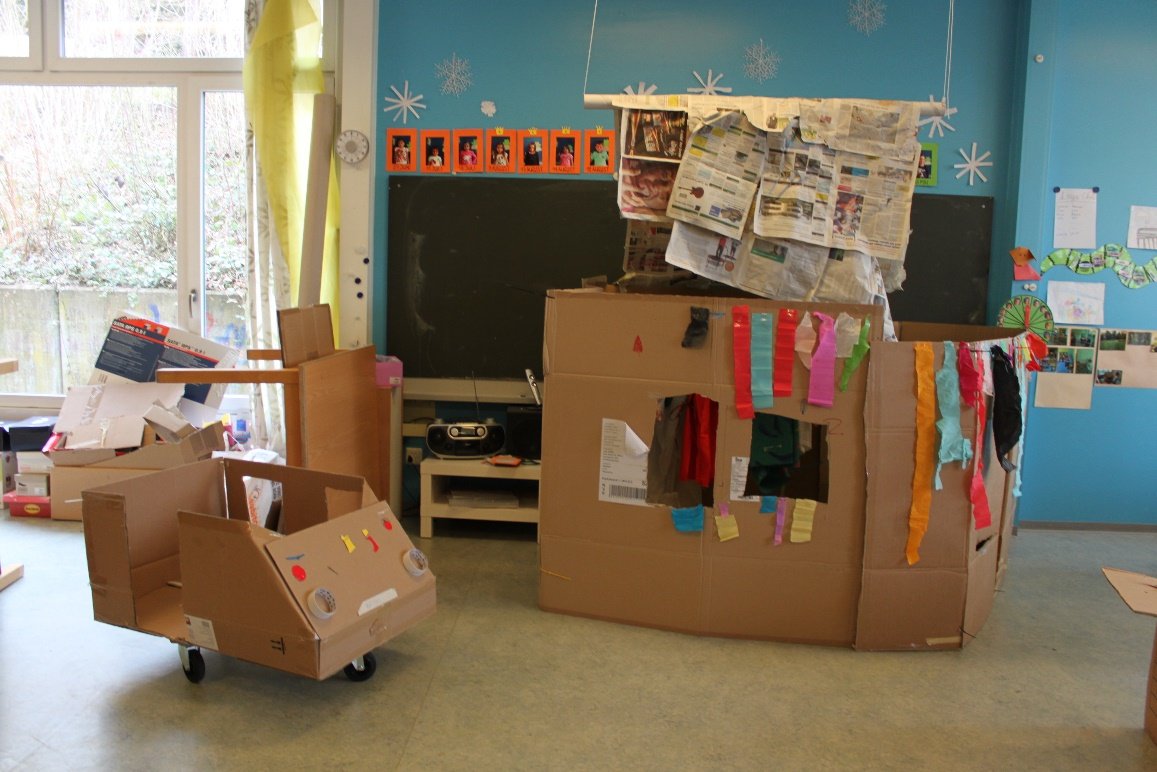 Was im Rollenspiel gerade benötigt wird, wird gebaut. Immer längere Spielsequenzen entstehen und jeder bewohnt bereits ein selbstgebautes Haus. Von dort aus besucht man die anderen, geht einkaufen oder ins Restaurant. Wir leben in der Karton-Stadt.